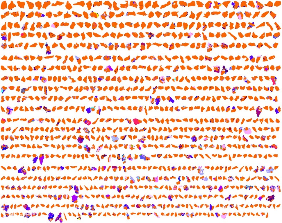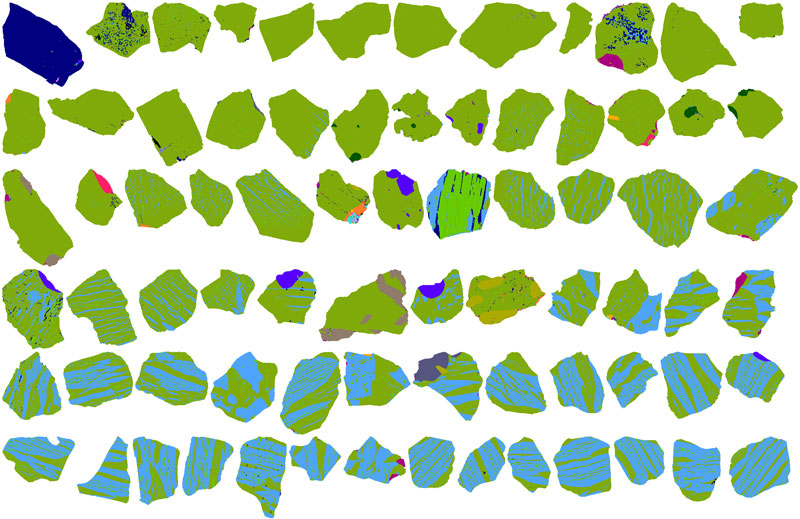 • The mineral particles are discriminated from the mounting epoxy based on the BSE contrast. The epoxy is considered as a low brightness background and excluded from the analysis.