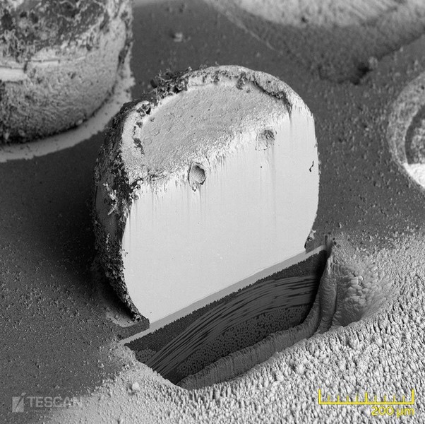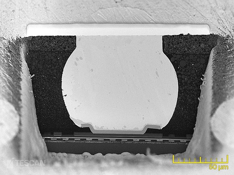 - TESCAN Xe-Plasma-FIB-REM-Systeme (FERA3, XEIA3) können Lötkugeln bearbeiten, welche einige hundert Mikron Durchmesser haben können. Ein Querschliff kann auch bei so großen Volumina mühelos in unerreicht kurzer Zeit durchgeführt werden.