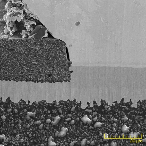 - Der TESCAN BSE-Detektor liefert hohe Kontraste. Damit werden intermetallische Mischungen und verdeckte Metallschichten deutlich sichtbar. Die Inspektion und Charakterisierung von einzelnen Lötkugelquerschliffen in BGA‘s ist die entscheidende Aufgabe zur Bestimmung der Verlässlichkeit einer integrierten PCB-Schaltung. Die Qualität des Lötprozesses muss bestimmt, Fehlerursachen müssen identifiziert und eliminiert werden.
