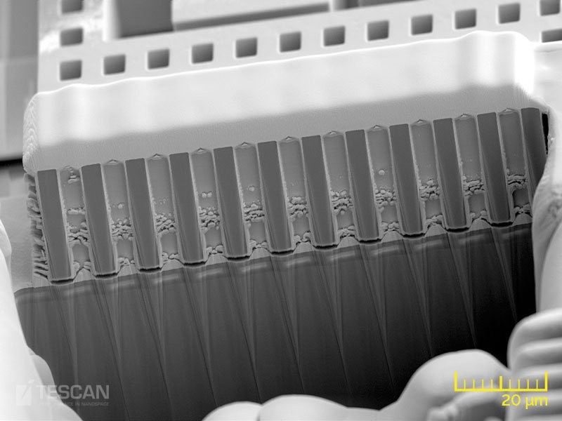 - Die hohe Auflösung und große Tiefenschärfe machen TESCAN REM und FIR-REM zu hervorragenden Werkzeugen zur Untersuchung von Proben mit komplexer Topographie, wie es speziell bei MEMS der Fall ist.