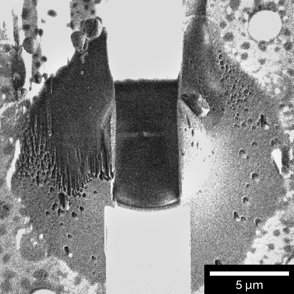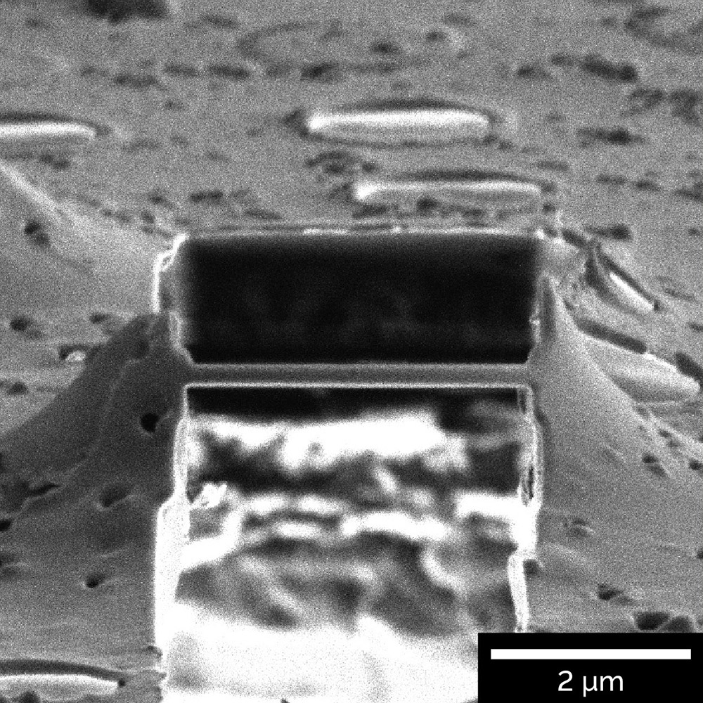 Top view of a thin lamella prepared for subsequent cryo-TEM analysis.