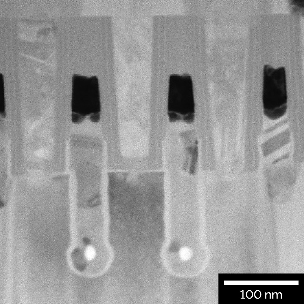 Imagen STEM-BF de lámina TEM de 80 nm de espesor de nodo DRAM de 65 nm